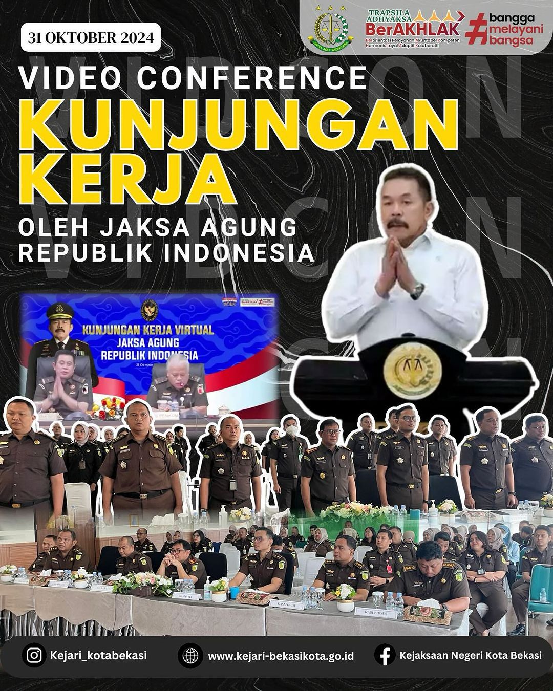 Kamis, 31 Oktober 2024, bertempat di aula Kejaksaan Negeri Kota Bekasi, Kepala Kejaksaan Negeri Kota Bekasi Imran Yusuf, S.H., M.H. beserta seluruh jajaran Kejaksaan Negeri Kota Bekasi mengikuti Kunjungan Kerja oleh Jaksa Agung Republik Indonesia ST Burhanuddin yang dilaksanakan secara virtual melalui video conference zoom.
