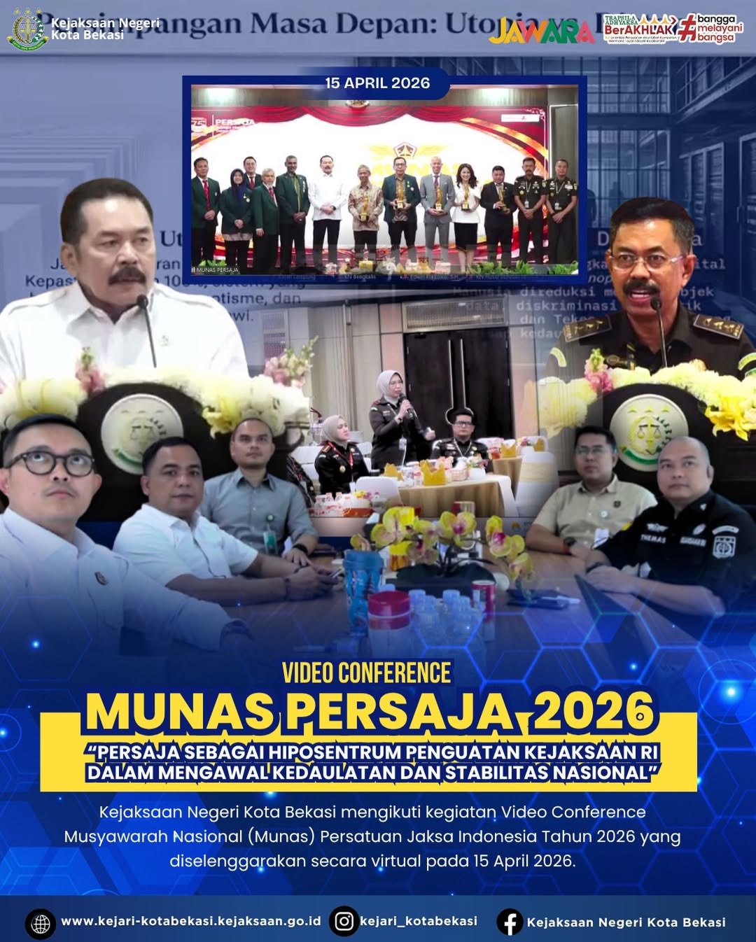 Kejaksaan Negeri Kota Bekasi mengikuti kegiatan Video Conference Musyawarah Nasional (Munas) Persatuan Jaksa Indonesia Tahun 2026 yang diselenggarakan secara virtual pada 15 April 2026.